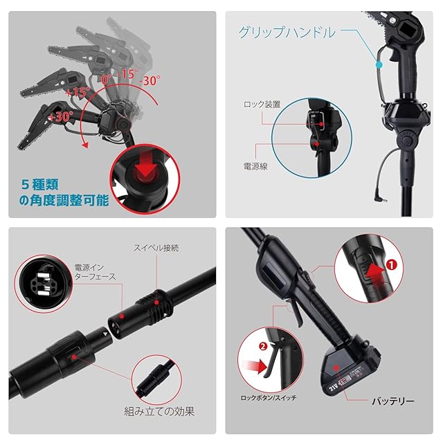 2 in 1高枝切ミニ電動チェーンソーの組み合わせ:ミニ 6インチ チェーンソーと高枝切り電動チェーンソーを自由に切り替えて、伸縮式ポールで高い枝木の切断だけではなく、手持ちの小型チェーンソーにも素早く変換でき、さまざまな作業に対応可能です。ヘッド部分は5段階(+30°・+15°・ 0°・ -15° ・-30°度)の角度を調節可能ので、作業によって簡単に調整でき、手軽に枝を切断できます。