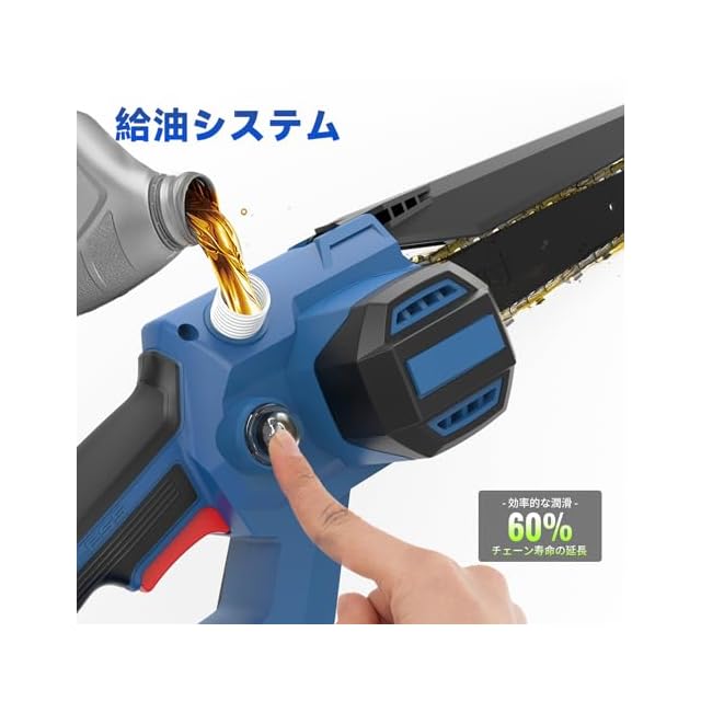 【給油システム&工具レス調整】この充電式チェーンソーには給油システムが装備されています。給油タンクにオイルを注ぐだけで、必要な時にポンプを軽く押すとチェーンに給油できます。またミニチェーンソーはソーチェンの張り具合調整とカバー取り外して中の掃除をする時、他の工具が要らず本機のつまみを回すだけ、迅速なおかつ気楽で高効率性が実現します。