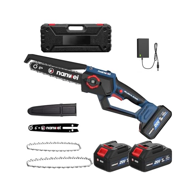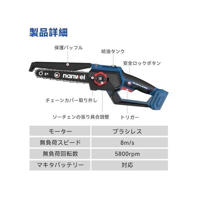 NANWEI チェーンソー充電式 8インチ マキタ18Vバッテリー対応 工具レス調整 電動チェーンソー ブラシレスモーター 電動のこぎり 6インチ小型チェーンソー 4.0Ahバッテリー2個付き 軽量 伐採・枝払い・枝打ち・薪作り・庭木の剪定 | ascend