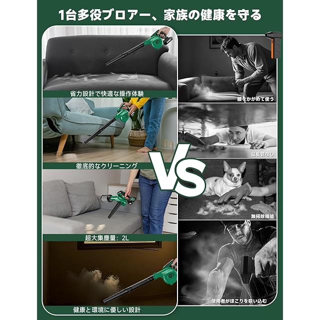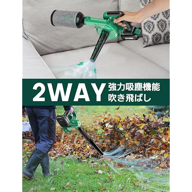 【軽量&広範囲に使える】ノズルとバッテリをブロワ本体に接続するだけで使用できます。わずか1.8kgの重量で、高齢者・子供も片手で使えます。庭の落ち葉掃除、車内の掃除、家具のほこり、コンピューターや他の電気製品の内部に積もったほこり、BBQの火起こし、洗車後の水飛ばし、作業場所の掃除など。壁の隅やベットの下、髪の毛のゴミを簡単に吸い込みます。注意事項:吸塵の際は、鋭利な物、濡れた物、石・砂利、金属片といったものを吸い込まないでください。