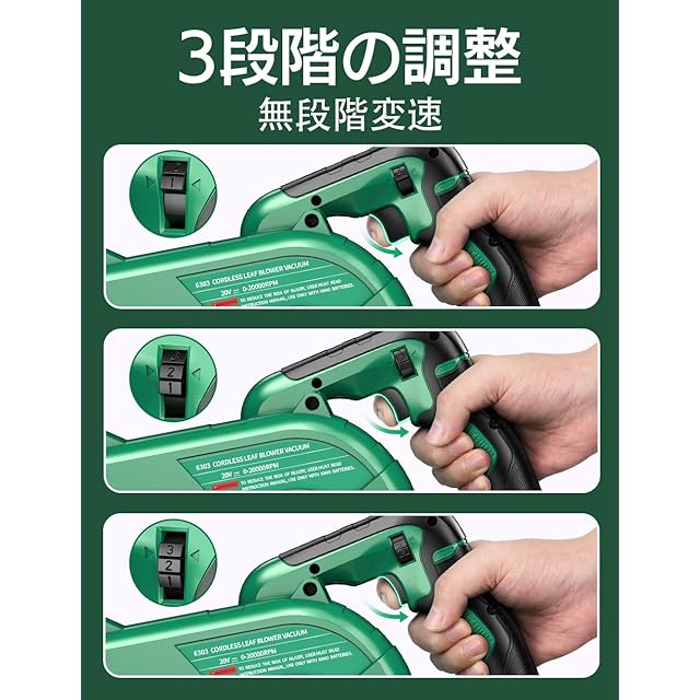 【3速変速調整&優れたバッテリーの持ち】6303ブロアーバージョンでは、既存の無段変速機能に3段階の風速調節機能が追加されました。それにより、異なる速度設定で無段変速が可能となり、より便利に使用することができます。KIMOコードレスブロワーは、20V 2.0Ah*2の大容量リチウムイオンバッテリーを搭載しており、電動工具の高い出力特性に対応した高電力で軽量・コンパクトさを実現しました。