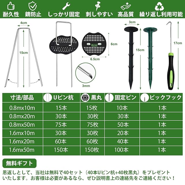 5【製品仕様・ご注意】サイズ:1.6*50m/パッケージ内容:防草シート*1、スチール製Uピン杭*150、黒丸*150、固定ピン*100、ピックフック*1、日本語説明書*1。★ご注意:初めてご使用時に、防草シートを地面に設置した後、水やりホースなどで完全に水を撒いて濡らしてください。防草シートを水に浸した後、3-5日放置して、透水効果はより良くなります。