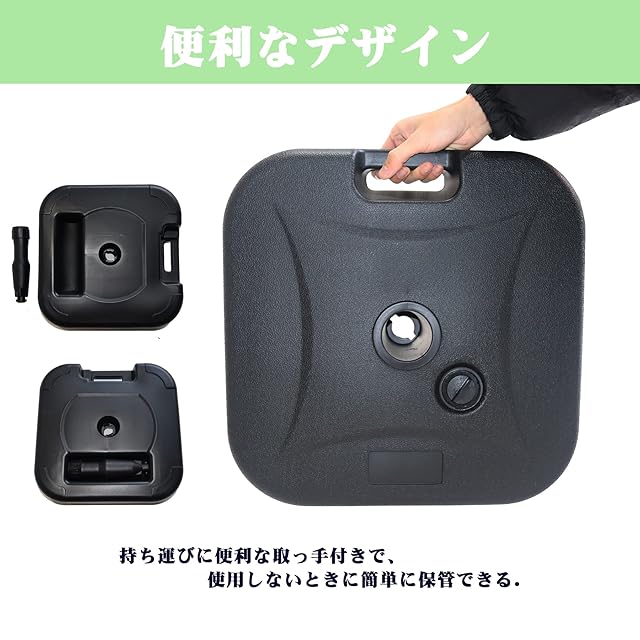 使用簡単:ベースは、最大22リットルの水或いは砂等充填可能、パラソルの安定性を確保できます。使用後は中の水を抜けば軽くなるので持ち運びにも便利です。本体は取っ手付きなので持ち運びがラクラク!