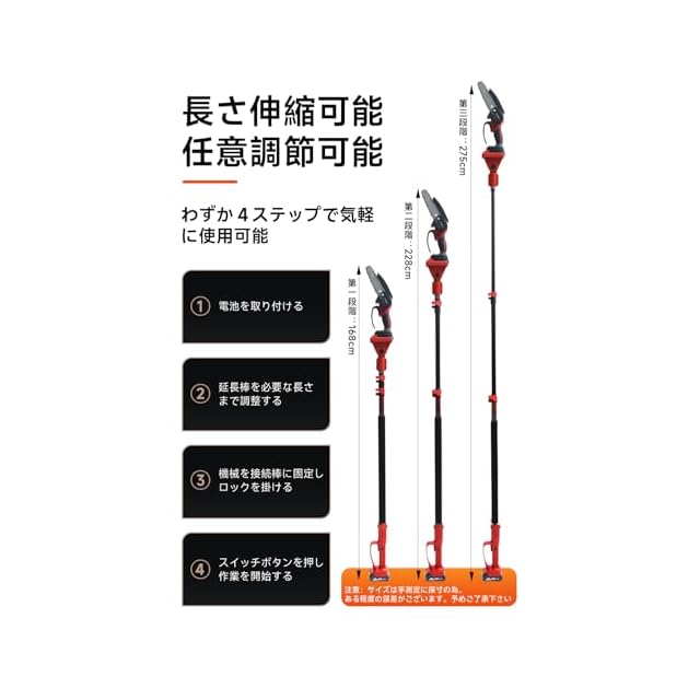 [3-in-1 高性能高枝切り電動チェーンソー] この高性能の高枝切り電動チェーンソーは、電動チェーンソーと電動バサミの機能を組み合わせ、さらに2.4メートルの伸縮延長ポールが付属しています。ポールの長さは1.94メートルから2.45メートルまで無段階で調整可能で、高所の木の枝を簡単に切ることができます。ヘッド部分には、180°回転するボタンが装備されており、作業に応じて切断角度を調整できます。これにより、あらゆる角度での刈り込み、伐採、高所作業を簡単にこなすことができます。一台で多様な作業を完了させることが可能です。 ご注意:本製品(ハサミ)はバッテリー残量表示はされません。