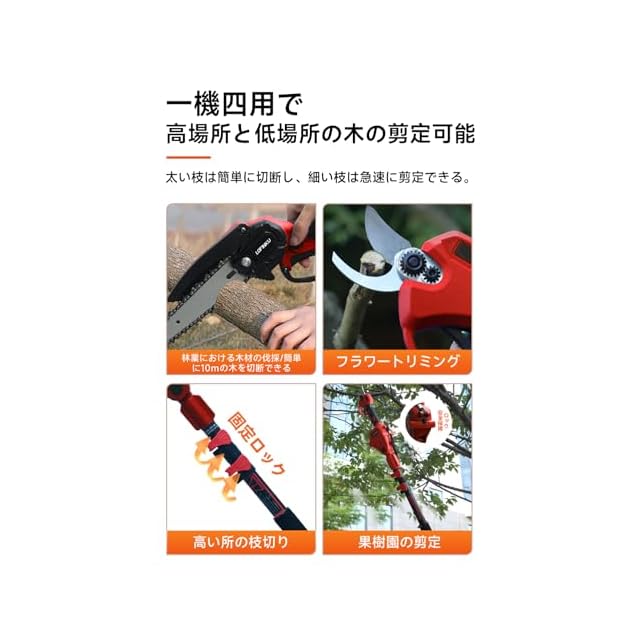 [安全性優先の多重保護機能] 高枝切り電動チェーンソーには、二重ロックシステムが備わっており、誤操作を防止します。電動チェーンソーを起動するには、電源ボタンとロックスイッチを同時に押す必要があり、この操作により、誤って起動することで生じる損傷を効果的に防ぐことができます。高枝ポールには、意図しない落下を防ぐ安全装置も装備されており、使用時にはカシメを電動チェーンソーまたはハサミの底部に押し当てるだけで、機器の想定外の脱落を防ぐことができます。 高枝切り電動ハサミ起動は、迅速に2回トリガーを引くことで刃が作動します。このツールの使用では、安全が常に最優先されます。