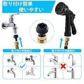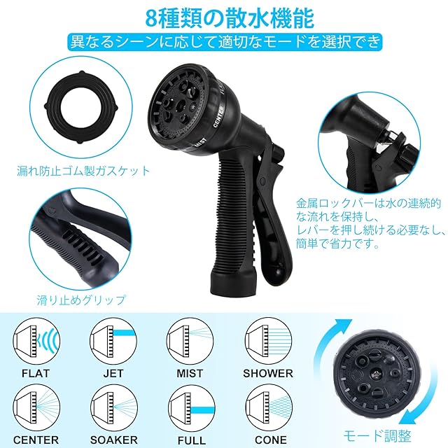【8㏌1散水機能】8种異なる噴水機能があり、回転するだけでモードを調整し、異なる水形、水量、水圧を調整することができます、シーンに応じて適切なモードを選択できます。噴射ノズルの後ろにある金属のバックルを使って水流を維持することができ、常に押し続ける必要はありません。庭の植栽、車の洗浄、ペットの洗浄、家の清掃、大掃除など、さまざまな屋外活動に適しています。
