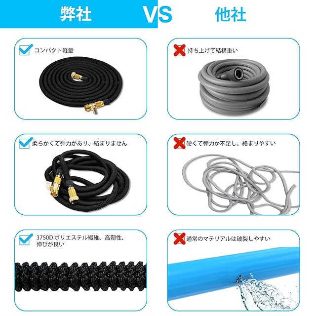 【破損しにくい仕様】ホースの外管には頑丈で耐久性のある3750D高品質ポリエステル生地が使用されており、伸縮性が優れ、弾力があり、強靭です。絡まりや破裂が発生せず、外部からの鋭利な物体の衝撃や擦り傷から効果的に保護されます。さらに、接続部には銅合金めっきが施されており、耐腐食性が高く、耐寒性、耐熱性があり、温度変化や湿気による錆びの心配はありません。