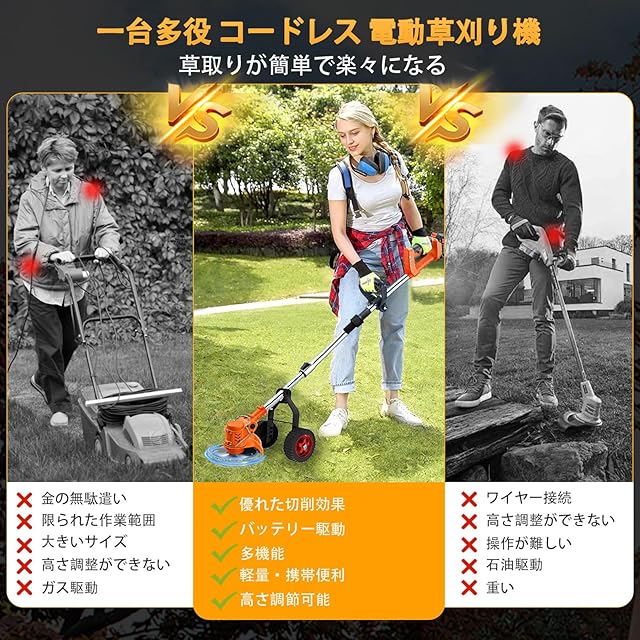 【デラックスアクセサリーキット】芝刈り機パッケージ内容: 芝刈り機x1、2000mAhバッテリーx2、ホイールx2、プラスチックブレードx5、ステンレススチールソーブレードx2、; 雑草イーターストリングx2、6inスチール丸鋸ブレードx1、スチールストレートブレードx1、携帯ハンドルx1、充電器x1、作業手袋x1、ゴーグルx1、ドライバーx1、 Lドライバーx1、アクセサリー収納バッグx1、日本語取扱説明書x1。完璧な組み合わせにより、追加のアクセサリーを購入することなく、すぐに使用することができます。
