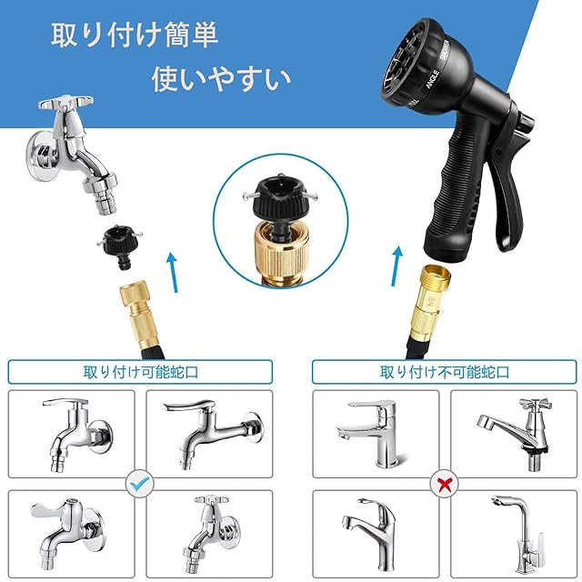 【多機能蛇口コネクター付属】14~18mmの丸型蛇口に対応する蛇口コネクターを付属。組み立て簡単で、漏水防止用Oリング内蔵により安心して使用可能。水圧0.3pa以上で最大3倍に伸びるため、広い庭やベランダでも便利です。