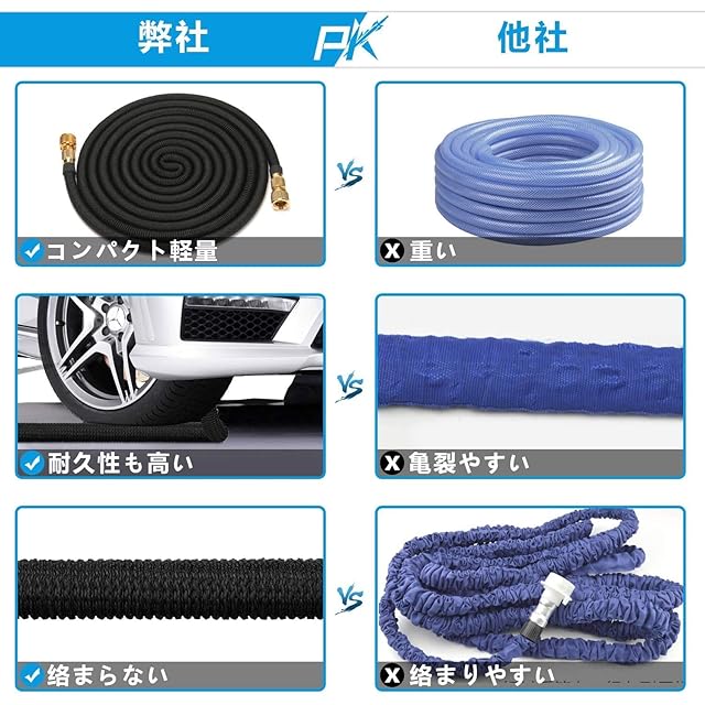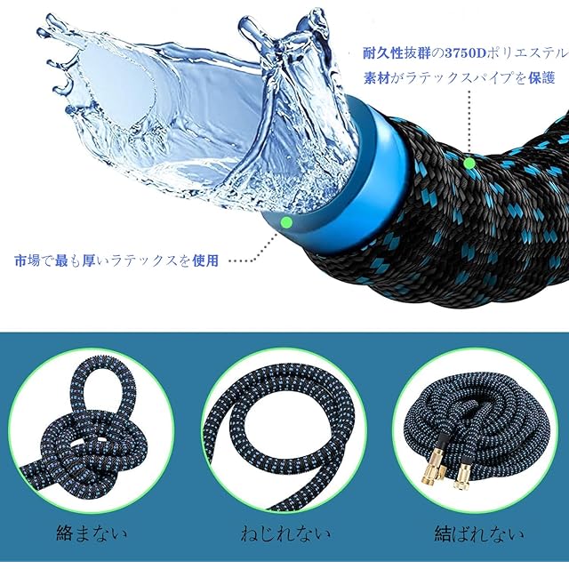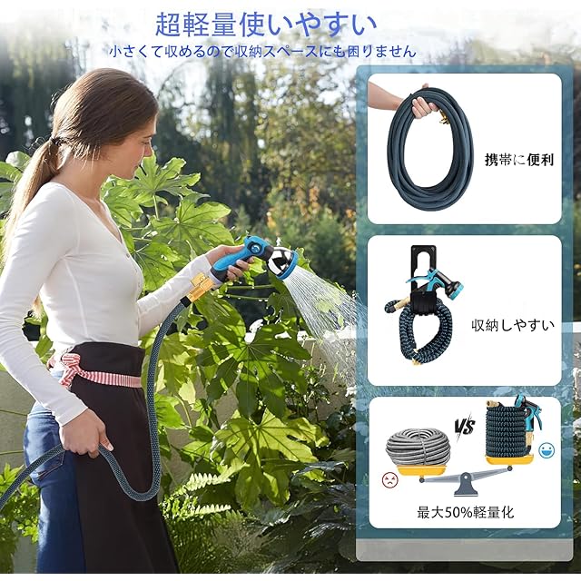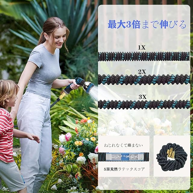 【3倍伸縮可能な天然ラテックス素材】水圧をかけるとホースが最大3倍(例:10mから30m)に伸び、使用後は自動的に縮む便利な設計。2mmラテックス内層と超強度外層を採用し、耐摩擦性と耐久性に優れています。水やり、洗車、庭掃除など、幅広いシーンで活躍します。