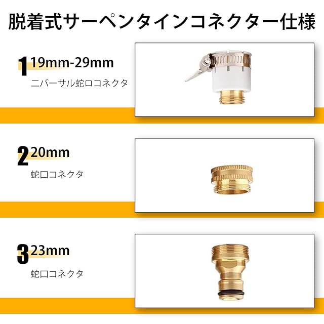 【さまざまな丸型蛇口に対応】散水ホースには、異なるタイプの丸型蛇口に対応可能な3種類の蛇口コネクターが付属しており、多くの家庭用蛇口に簡単に接続できます。取り付けは工具不要で、初めての方でもスムーズに行えます。さらに、接続部の密閉性を高めるためのシーリング用パッキンも付属しており、水漏れの心配を軽減します。使用後は付属の収納バッグにすっきりとまとめて保管でき、家庭での収納にも便利です