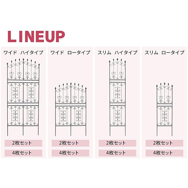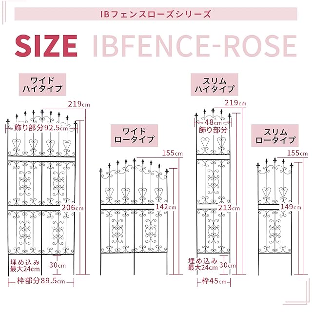 お庭をエレガントに彩るIB(アイビー)フェンスシリーズにシンプルで華やかなローズシリーズが登場!!つるバラなどの植物を誘引すればお庭をダイナミックに演出できます。カラーはシックなブラックなのでお花の色彩や緑を鮮やかに引き立てます。横幅はワイドタイプとスリムタイプ、高さはハイタイプとロータイプの展開で、ちょっとしたスペースから広い範囲の連続フェンスまで対応できます!