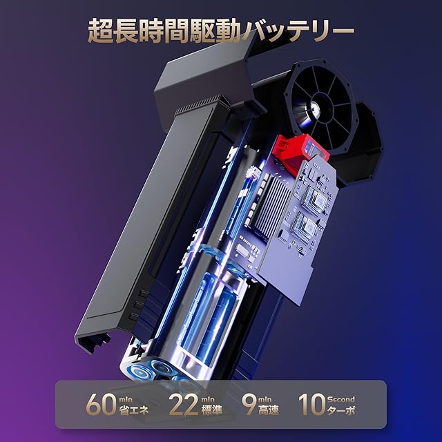 [大容量バッテリーで長時間使用可能] 4000mAhの大容量バッテリーを搭載し、効率的に長時間動作します。1速で最大80分、2速で30分、3速で12分、最強 モードで約6分の連続使用が可能です。これにより、洗車や庭の清掃など長時間の作業にも対応できます。