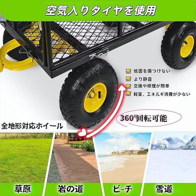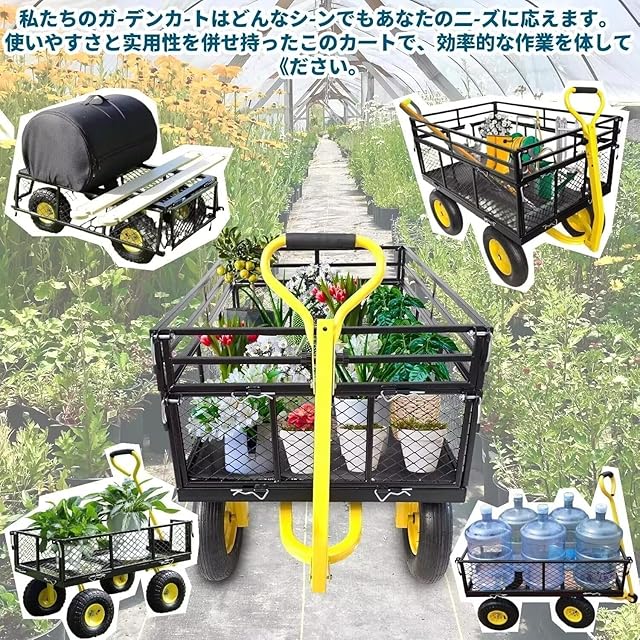 【幅広い用途】日本語説明書付きのため組み立てが簡単。庭、農場、倉庫、アウトドアなどでの使用に最適。このガーデンカートは、鉢植えの植物、土、木材、フェンスの支柱、木の手足などの大きな物を効率的かつ簡単に運ぶことができます。