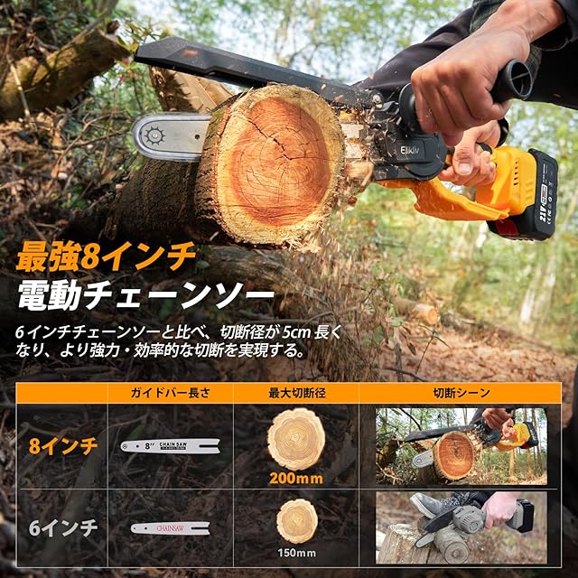 【2 個の残電表示付き大容量 4.0Ah バッテリー】高枝切りセットE8Kには、残電表示が可能な大容量 4.0Ah バッテリー 2 つが搭載されています。交互使用が簡単なので、頻繁な充電の手間が省けます。この手持ちのチェーンソーは屋外作業でも時間的な制約を受けることなく、高効率な作業状態を維持できます。さらに軽量設計で、操作が便利で、高所の剪定作業や作業現場でも快適に使用できます 。注:1. 付属の充電器は、付属のバッテリーのみを充電できます。2. 電池の過放電を防ぐため、月に 1 回以上は電池を充電してください。3. バッテリーは ASIN:B0CNSM4WQB のものを購入してください。