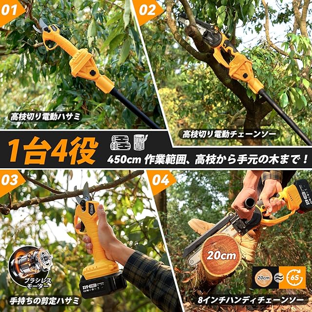 Elikliv 高枝切りチェーンソー たかえだ 電動 チェーンソー 充電式 高枝切り剪定ハサミ 電動バサミ セット 1台4役 強力 8インチ ハンドチェーンソー ブラシレスモーター オイル指し 伸縮ポール 125cm~250cm無段階伸ばす 高枝電動のこぎり パワフル プロ伐採 木工切断 庭木の剪定 4.0Ah大容量バッテリー2個付き 型番E8K | ascend