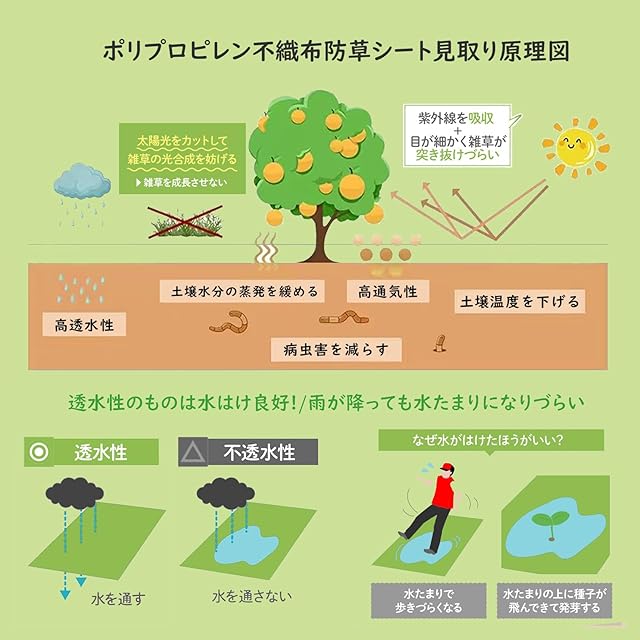 【優れた遮光性】防草シートは高品質の耐候性不織布を採用しており、日光を遮り雑草が生えにくいです。遮光率最大95%なので光を遮ることで光合成を防ぎ、化学除草剤を使用せず、生分解性があるため、使用後の自然分解が可能。環境保護にも貢献します。