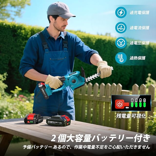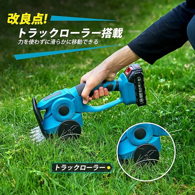 【一台 4 役 & 最新改良の芝生バリカン】改良点❶Elikliv の充電式ヘッジトリマーには、最大切断長 220mm、最大切断径7mm の生け垣剪定ブレードと最大トリミング幅 130mm の芝生剪定ブレードが装備されています。芝生バリカンと草刈機を自由に切り替えることができ、園芸剪定作業をより便利にすることができます。刃物交換は半工具レス生垣バリカンへチェンジ可能、トリマーブレードを装着すれば、植木の剪定も可能です。改良点❷この芝刈り機はトラックローラー付きで、操作が大幅に楽になり、力を使わずに滑らかに移動できるため、作業者の体力消耗を減らします。広い芝生で作業する際にも、位置や方向を簡単に調整でき、作業能率を向上させます。改良点❸プロテクターが搭載されており、跳ね石を防止して安全な作業環境を提供します。
