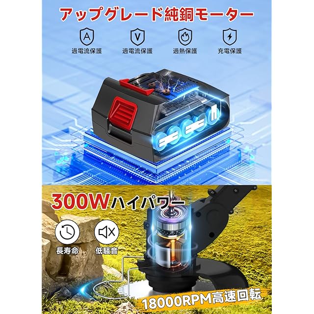 【コードレス設計&大容量バッテリー&純銅モーター】コードレス設計の充電式芝刈り機は持ち運びが簡単で、便利に使えます。また草刈り機 充電式には大容量4500mAhのバッテリーは2個を付属しているので交互に使用でき、最大約60分の連続作業が可能で(バッテリー2個がフル充電の場合)、作業途中でバッテリー切れで作業が中断することもなく便利です、広い作業範囲や大きな庭の除草作業にも対応できます。 この草刈り機 充電式は最新の研究開発技術を活かし、純銅製モーターを使用しています!300Wの出力で、内蔵純銅製モーターは、強力なブラシレス高回転(18000rpm)直流モーターにアップグレードしました、草刈り効率を大幅に向上させ、最大1時間の連続作業が可能です!