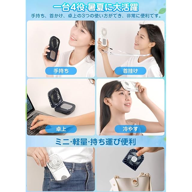 【180°折り畳め・超軽量・持ち運びハンディ扇風機】伝統の卓上扇風機と違う、弊社の扇風機は折り畳むことで卓上機能を実現します。上下方向に180°折り畳む可能、自分の好みに合わせて角度を調整できます。超コンパクトサイズ・軽量タイプでバッグにすっぽり収納でき、持ち歩いても負担にならない。152gの軽量で首にかけても負担が少ない。さらに、手持ち扇風機に変身してデスクの上に自立して使用することも可能。手に持っても机の上にも首にかけても 3way、室内外問わず、幅広く活躍でき、使い勝手抜群な小型扇風機です。プレゼントとしても大変喜ばれるアイテムです。