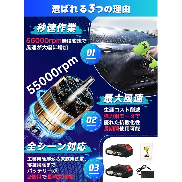 【先進モーター技術】 ジェットブロワーは先進的なターボ技術を採用し、最大55,000 RPM・150 MPHの風速を実現します。これにより、対象エリアの効率的な清掃をサポートいたします。 ※ご注意:湿気の多い環境や濡れた落ち葉が対象の場合は、効率が低下するためご使用をお控えください。