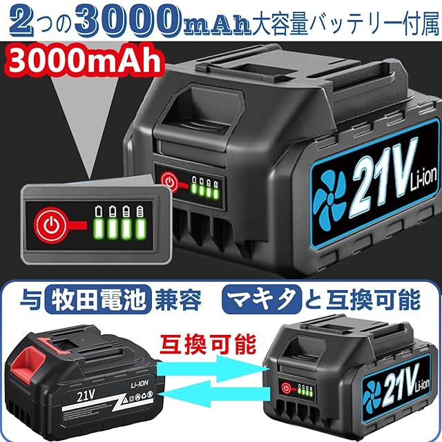 【PSE認証取得2個3000mAh大容量バッテリ一】 30%稼働時間か增加。バッテリーはPSE認証済みなので、より安心してご使用いただけます。充電式 ブロワーは数万人のユーザーを調査した後、使用ニーズに基づいて 2025 年向けの最新のバッテリーを開発し、当社のバッテリーが市販されている同じ 3000 mAh バッテリーよりも耐久性が高いことを保証しました。同じ3000mAh 当社のバッテリー30%稼働時間か增加。爆風 ブロワーは大容量バッテリーを搭載しているので、作業途中で充電する必要がなく、長時間効率よく作業できます。バッテリーには電量表示ランプあり、洗車しながら、エアーダスターバッテリーの残量が一押しで分かります。本ブロワー 強力はマキタ21Vリチウムバッテリーで対応可能、BL1830 BL1840 BL1850 BL1860 BL1860B BL1830B BL1850B BL1860B BL1890Bなどが適用します。