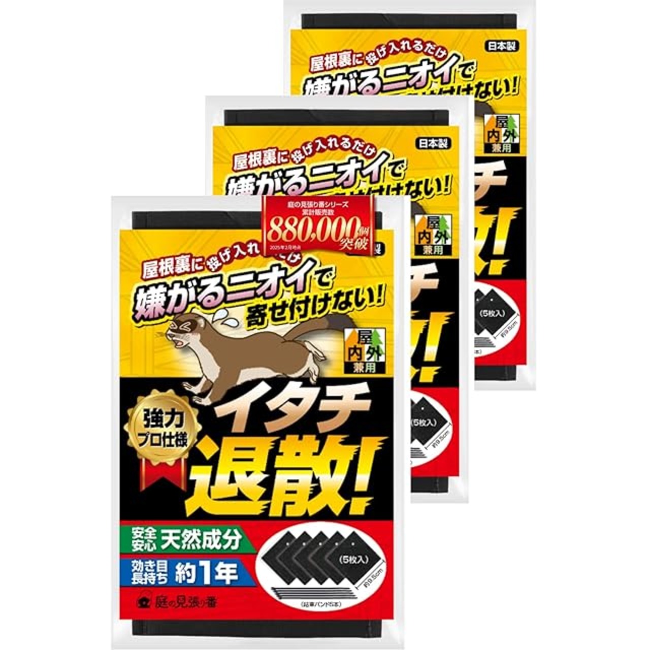 庭の見張り番 イタチ退散! イタチ 忌避剤 イタチ撃退 グッズ 屋根裏に投げ入れるだけ!屋内外兼用【強力プロ仕様・天然香料だから安心・効き目長持ち約1年】便利な結束ベルト付 5枚入×3P(7.5〜15畳用) | ascend