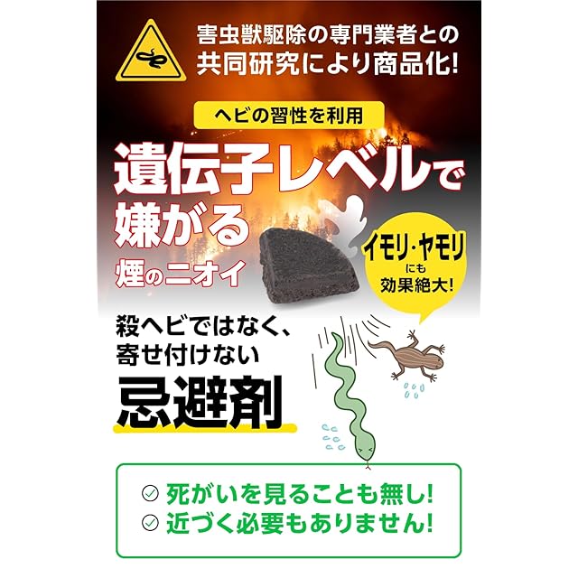 【死がいの処理不要・シリーズ累計880,000個突破!】殺蛇ではなく、ヘビが自ら去ってしまう環境を作ります。蛇よけ剤なので、ヘビの死がいを処理したり触る必要もなし。山火事だ、逃げろ!遺伝子レベルで木の煙を嫌う、ヘビの習性を利用。ヘビを寄せ付けない「煙のニオイ」でへびよけします。お陰様でシリーズ累計88,000個突破!致しました。ご愛用頂き誠にありがとうございます。