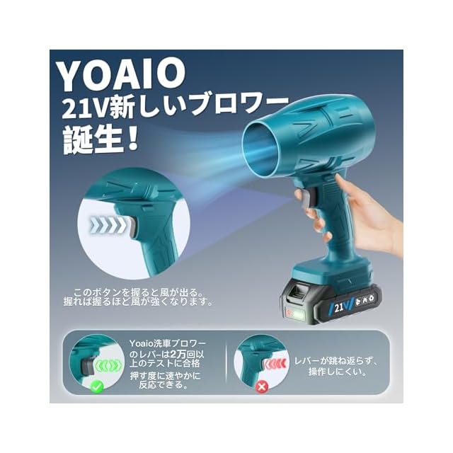 【 洗車 ブロアースイッチは2万回以上テストに合格】Yoaio 洗車 ブロワーのモーターはもちろん、電気エアダスターのトリガーも1個1個丁寧に点検し、トリガースイッチは全部2万回以上のプレステストに合格しました。ダストブロワー本体は高硬度、高耐熱性の素材で作られており、長期間の使用耐久性を備えています。ハンドル部分は手に合わせやすいラインを利用し、長時間作業し続けても手が疲れません。使用中にスイッチが元位置に飛び跳ねられない、トリガーを押しつづくがきついとの心配はもう要りません。