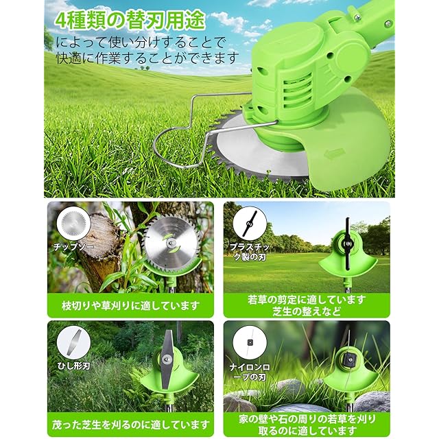 草刈り機 充電式【鈴木造園会社監修】 芝刈り機 充電式 コードレス 1.2kg軽量 低騒音 電動草刈り機 軽量 4種類替刃 18500RPM 伸縮式草刈り機 4000mAh大容量バッテリー2個 脱着式ホイール 90° 3段階で角度調整可能 多地形4種類替刃枝切り 菜園 農業 家庭園芸用機器 掃除が楽 日本語説明書付(Green) | ascend