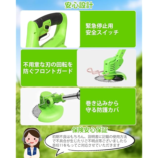 【アップグレード版無線草刈り機】新型のアップグレード版の電池は電力を供給して草刈り機の製品を増加しました!腰をかがめて草刈機を操作する必要がありません。背中の張りや損傷を軽減できます。これは快適さを高め、使用中の痛みを軽減します。重量物を効率的に分散させる設計です。は芝刈り機を両手で操作しないように設計されています。庭、農場、造園、庭園の手入れが簡単になります。 【多機能電働草刈り機】こ項は充電式草刈機 がたくさんの機能を集めて製品を変える上で集中します:芝生の剪定机/芝生の辺を修理する机/小型の芝刈り机/灌漑机を刈ります。電源コードを問わず、どこでもお使いいただけます。2×4000mAhの高容量充電式リチウムイオン電池を内蔵し、動作時間は80~90 Minです。900Wの高出力純銅モーターを搭載し、空載回転数18500RPMを実現し、日常の掃除ニーズにも対応します。草取りが負担ではなく、家族と一緒に剪定を楽しむことができます! 【4種類のカット刃(27 PCS)】バッテリー駆動の草刈機は4種類の刃を持って、十分にあなたの草刈りの需要を満たすことができます。①プラスチックの刃は柔らかい芝生と軽い雑草を切るのに適しています、②芝刈り机ロープは高くて密な草地を剪定することに適用します、③菱形の刃はうっそうとした雑草と生け垣を切ることに適用します、④ノコギリは枝切りに適しています。より専門的な道具を使うことで、ガーデニングをより楽しく楽しくすることができます。 【軽くて、使いやすくて、低騒音】草刈り機 充電式はわずか0.8KGで(本体)、軽くて使いやすくて、女性、子供、お年寄りに適しています。両開き/ offボタンの設計により、不慮の起働によるダメージを防ぐことができます。雑草飛び散り防止カバーは、刈った雑草の飛び散りを防ぎます。騒音低減設計が最適化され、作業騒音は72デシベルと極めて低く、隣の人の睡眠に影響を与えません。庭や植え込み、歩道、庭などの周りで静かに草刈りをするのに最適です。 【豪華な部品のセット】コードレスの電池の草取り机のセットはを含みます。1 x草刈り機、2 x 4000mAhの電池、1 x携帯ハンドル、3 xノコギリ、3 x菱形の金属の刃、1 x衝突を防止し、1 ×バッフル、1 ×部品の包み、4 xロープ、6 xプラスチックの刃、1 xユーザーマニュアル、1 x急速充電器、1 x作業手袋、1 ×ゴーグル。完璧な組み合わせで組み立ても使いやすく、ガーデニングをより楽しむことができます。 【安心-アフターサービス】100%お客様満足は私たちの最優先課題です。アフターサービスチームと技術者はオンラインで24時間オンラインサービスを提供します。使用、部品の欠陥、製品の欠陥、バッテリー充電、インストールなどの問題については、直接ご連絡ください。私たちは100%問題を解決します。お父さん、お母さん、友達、夫、妻と勤勉な労働者などのための最高の完璧な草刈り機です