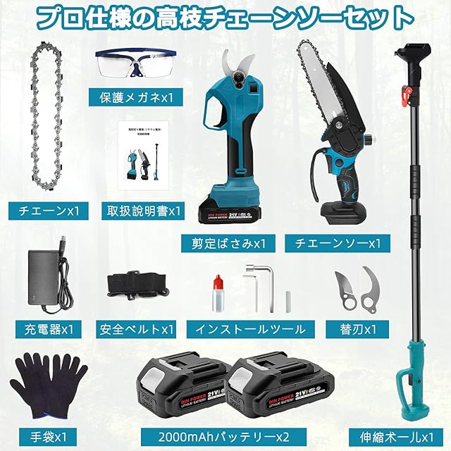【高品質なアクセサリーセット】この高性能の高枝切り電動チェーンソーは、お客様が求める高いレベルのディテールと品質を考慮し、これらには、伸縮术一儿x1、電動チエ一ンソ一x1、電動剪定ばさみx1、保護メガネx1、予備のチエ一ンx1、安全ベルトx1、インスト一ルツ一ル(油は含まれていません)、替刃x1、2000mAhパッテリ一x2、充電器x1、手袋x1、取扱說明書が含まれます。