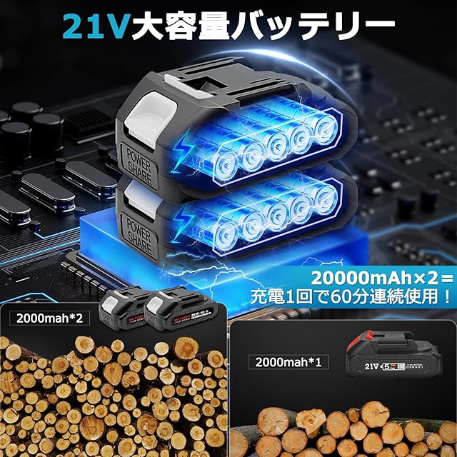 【2個2000mAhバッテリー付き】21V超強動力リチウム電池が2個付属しており、頻繁な充電と電線の束縛に別れを告げ、単回充電で40-60分持続的に作業することができ、果樹や木材伐採、高所作業などさまざまな場面で活躍します。