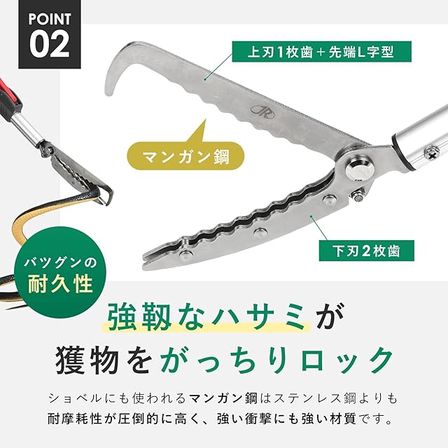ヘビ捕獲棒 は、ヘビの捕獲はもちろん、ゴミ拾いや高所の物取りにも活用できる多用途ツールです。最大150cmまで伸び、最短110cmまで収縮可能なため、作業時には十分なリーチを確保しつつ、使用しないときはコンパクトに収納できます。車のトランクや物置にもすっきり収まり、省スペースでの保管が可能です。 本製品のポールとハンドルには軽量かつ高強度なアルミニウム合金を採用し、長時間の作業でも負担を軽減。先端のハサミ部分には摩耗しにくいマンガン鋼を使用しており、耐久性に優れています。さらに、ハンドルロック機能付きで、確実に対象物をつかみ、安全に操作できます。 農林業やアウトドア活動、清掃作業を行う方に最適なツールです。ヘビの捕獲はもちろん、遠くの物を取る際やゴミ拾いにも役立つ多機能設計で、さまざまなシーンで活躍します。