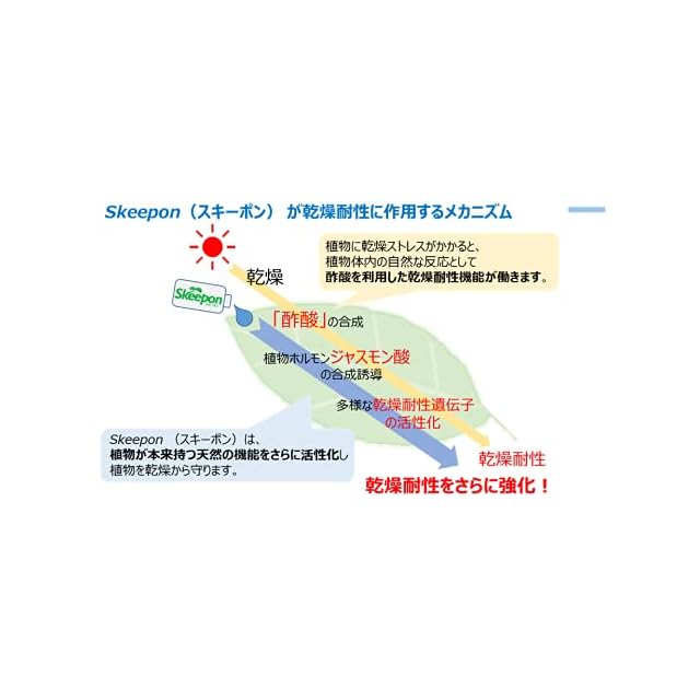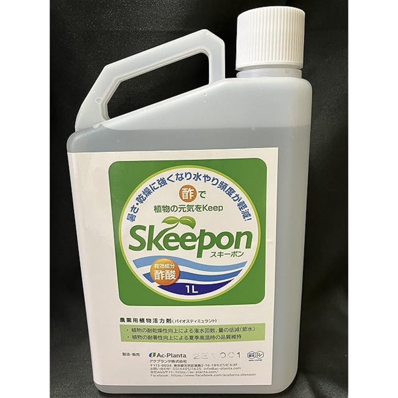 Skeepon(スキーポン) 理化学研究所の研究成果をもとに開発された、酢酸を有効成分とする植物活性剤(バイオスティミュラント)です。 農作物の乾燥と高温に対する耐性を高めます。 ・推奨施用頻度:250-500倍希釈液を定植前に根からたっぷり吸収させてください。・施用液量:128穴セルトレイ1枚あたり:希釈液1L、ポット苗あたり希釈液50ml程度。 ・推奨施用時期:通年 ・施用方法:根元に与える ・推奨方法:土の表面が少し乾くぐらいのタイミングで根元に水やり(灌注)してください。再度、土の表面が少し乾くぐらいのタイミングで、繰り返し根元に水やり(灌注)を行うと、さらに効果が強く発揮され、持続します。・注意点:植物が弱っているときに使用すると萎える場合がありますが、その後成長が活性化されますのでご安心ください。 【詳しい機能・メカニズム】 植物は水分が欠乏すると、体内で酢酸を作り出し乾燥に耐えます。 “Skeepon”は、この「植物が自然に持つ乾燥に耐える仕組み」をさらに活性化し、植物自体の生き残る力を高めることで、より長く強い乾燥を乗り越えられるように考え出された、酢酸を主成分とする安心・安全な製品です。またこの作用を利用することで、植物を熱(高温40℃くらいまで)に強くすることもできます。※雑誌「現代農業」2021年8月号に掲載頂いている商品です。