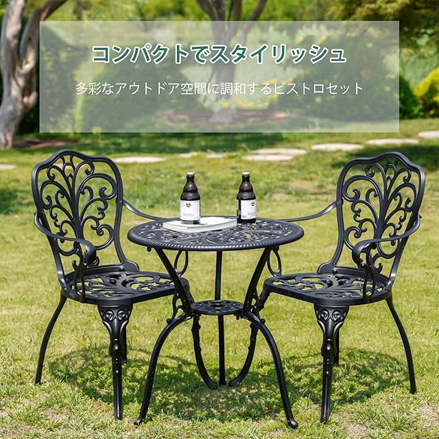 耐久性のあるビストロセット】屋外のビストロセットは、耐性のあるパウダーコーティングされた固体鋳造アルミニウム製で、防水性と防錆性、耐腐食性、耐クラック性、耐酸化性を備えています。すべてのねじ継手は錆びにくいです。全天候型鋳造アルミフレームは、このビストロセットの耐久性を保証します!