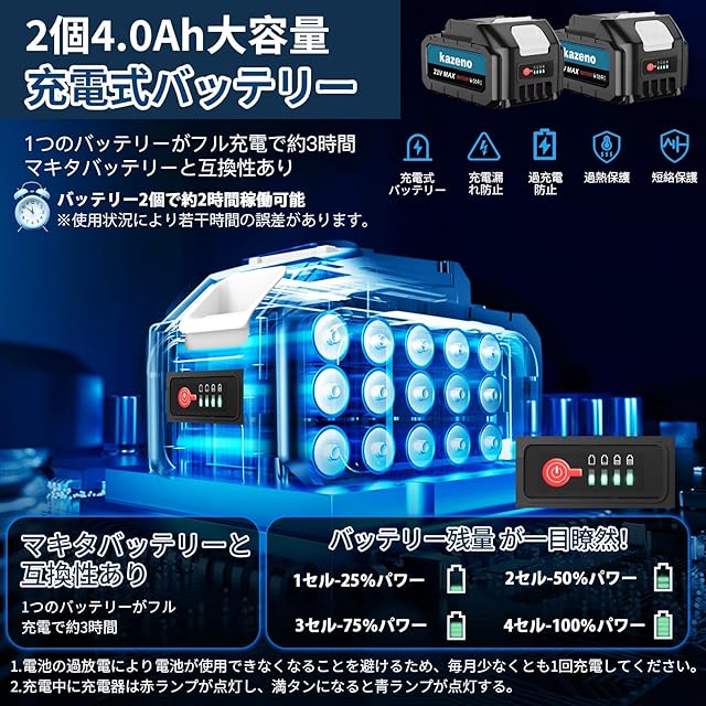 【電量表示付き4000mAh大容量バッテリー2個・マキタバッテリー対応】充電式草刈り機は、4000mAhの大容量バッテリー2個を搭載しており、バッテリーには電量表示ランプが付いており、残りの電量をリアルタイムで監視できます。フル充電後、最大2時間連続使用可能です。過充電、過放電、短絡保護機能が備わっており、安全に使用でき、バッテリーの寿命も延ばすことができます。コードレス設計により、電源コードに縛られることなく自由に操作でき、収納スペースも取らず便利です。また、マキタのバッテリーにも対応しており、利便性が向上します。