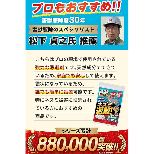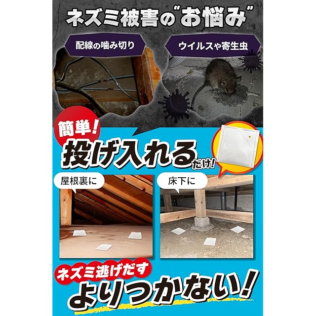 【効果長持ち1年間・ワイドな効き目0.5?1畳/枚】空気は通しても水は通さない特殊な内袋を使用しているため、屋内屋外兼用、約1年間しっかり効果が持続、ネズミ対策・撃退が可能です。ワイドな効き目で、約0.5?1畳/枚と広範囲にニオイが拡散します。設置間隔を"狭く"するとより効果が期待できます。