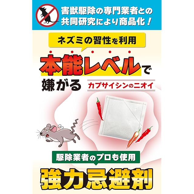 ネズミ対策に最適!設置後すぐに効果を発揮する屋根裏対策の忌避剤です。赤と辛み・ニオイでネズミを撃退!安全な植物性成分を使用。フン尿や動物の気配から解放し大切な家屋を腐敗から守る!1年間の持続効果で驚きの結果。特許取得済みの厳選した成分をマイクロカプセルへ封じ込めました。駆除業者に頼む前に試してほしい!コストパフォーマンス最高の商品です。カプサイシンを20%増量し、忌避効果をアップさせたNEW改良版です。