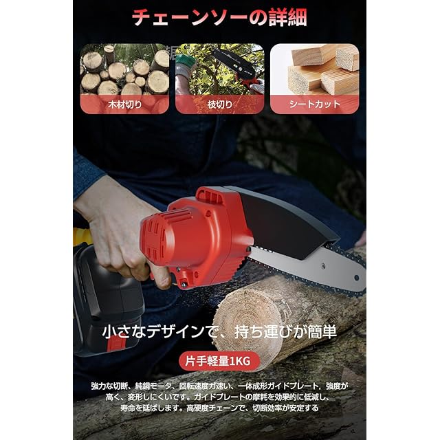?【チェーンソー・耐久性に優れ】チェーンとガイドプレートはいずれも高温硬化処理を経た良質な材料で作られているため、硬度が高く、優れた耐摩耗性と耐食性、鋭利で耐引裂などの特徴を持っており、耐久性に優れています。総重量わずか約1.1KGなので、コンパクトボディで取り回しが軽快、片手でも作業がしやすいです。