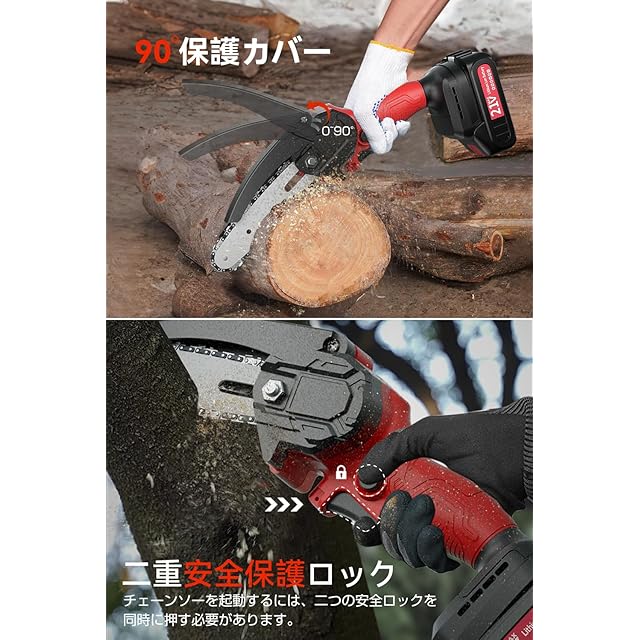 ?【多重安全保護] (1)、チェーンソーは事前にインストールされており、充電してバッテリーを取り付けるだけで使用できます。(2)、ANTI-MISTAKE保護:丸いロックボタンは、誤用の危険を防止するために、起動時にボタンとスイッチを同時に押す必要があることを意味します。(3)、バッテリー保護:通常の使用中にバッテリーが熱くなることはありませんが、バッテリーの過負荷や過熱の場合は、最初にモーターを停止し、バッテリーが冷えるのを待ってから再起動することができます。(4)、90°の保護バッフル: それは操作の間に木屑そして残骸を妨げることができる90°の保護バッフルと設計されています。90°保護フラップ:作業中の木屑や破片をブロックし、ユーザーの目や顔に飛び散るのを防ぎます。複数の安全対策により、使用者は安心して安全に作業できます。 ご注意:初めて使用する場合はバッテリーを10時間以上充電して活性化して下さい!