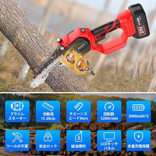 チェーンソー 充電式チェーンソー【9m/sブラシレスモーター&8インチ&6インチ&切断径15-20cm】自動給油ハンディチェーンソー 2個2.0Ahバッテリー 電動チェーンソー 軽量 LCD表示 強力 ミニ 小型チェーンソー ハンドチェーンソー ツール不要 安全ロック コードレス 竹・枝切り 庭木の剪定 薪作り 林業伐採 手袋 ゴーグル ボトル 替え刃 ケース付き PSE認証済み (Red)