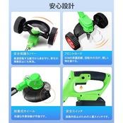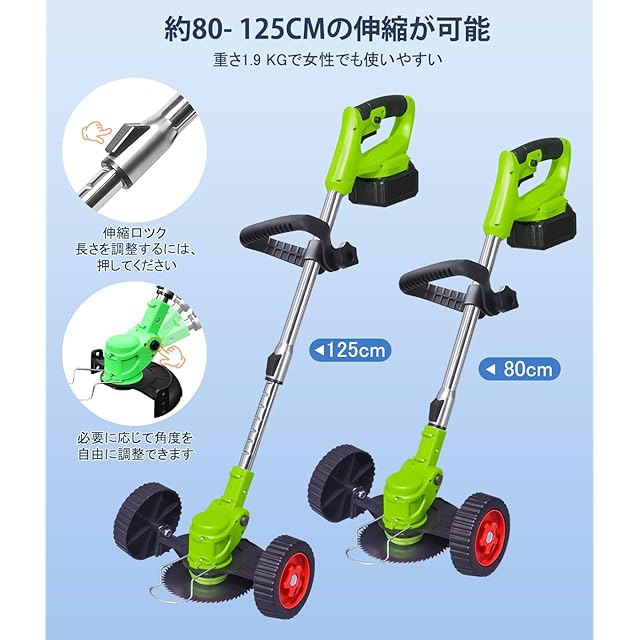 【パッケージリスト】芝刈り機本体*1、バッテリー*2、充電器*1、保護ゴーグル*1、手袋*1、円状の刃物*4、菱形の刃物*5、プラスチック製刃物*10、ナイロン製のひも*5、取っ手*1、衝撃防護力バ-*2、保護力バ一*1、スパナ*1、補助輪*1、日本語取扱説明書*1。ご購入またはご使用中に何か問題が生じた場合は、どうぞお気軽にお問い合わせください。