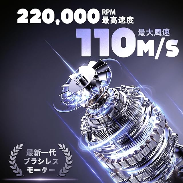 【超強風速110m/s & 220000RPM】エアダスター ブロワー革新的なブラシレスモーターを搭載し、従来比2倍のパワーと30%低騒音を実現。最大風速110m/s(22万回転)の暴風級パワーで、PC内部やキーボードのほこりを一瞬で吹き飛ばします。PSE認定済みで高温耐性を備え、耐久性と安全性が大幅向上。