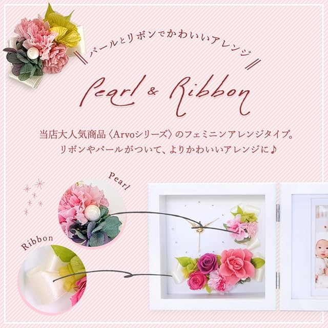 【商品説明】プリザーブドフラワーに時計と写真立てがセットになった、プリザーブドフラワーBOXです。プリザーブドフラワーは当店の専属コーディネーターが真心込めてアレンジしております。