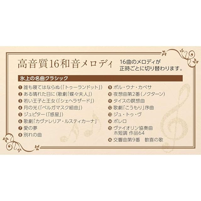 電波修正機能(40kHz/60kHz自動選局・受信OFF機能つき)、正時16曲メロディ