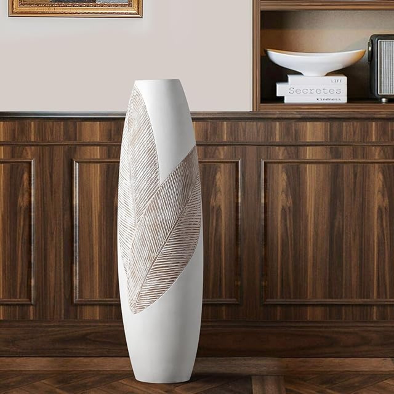 【クリエイティブなデザイン】当社の樹脂花瓶は、ユニークな葉の形をしたデザインが特徴で、花瓶に自然と芸術性を加えています。 金色に塗られた葉と白いボディの組み合わせは、花瓶を室内装飾の焦点にするだけでなく、細部と美学への献身を示しています。