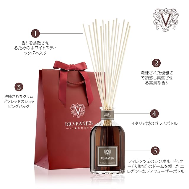 【直営】DR. VRANJES –ドットール・ヴラニエス ディフューザー OUD NOBILE〈ウード ノービレ〉1250ml ルームフレグランス リードディフューザー ウード ウッディノート リラクゼーション エレガントなオリジナルショッピングバッグ付き 琥珀色 メイドインイタリア | ascend