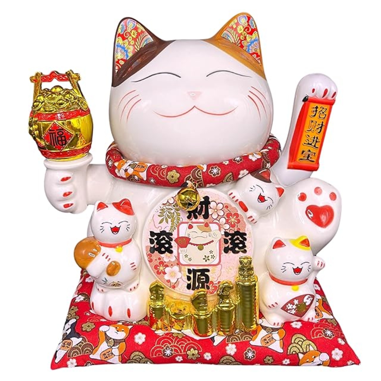 ☑かわいい猫の置物は、幸運を招く贈り物として商売繁盛や人寄せ用として開店祝いや、縁起物として新築祝いに、幸せと幸運、開運用に喜ばれています。左手には招財進宝と記載、右手には宝桶を掲げています。