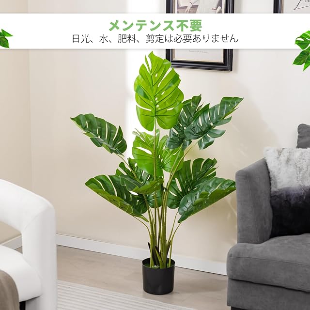 【自然な美しさとリアルなデザイン】この人工モンステラは、本物のようなリアルなデザインで、どんな部屋にもぴったりな美しいグリーンを加えてくれます。細部にまでこだわった葉の質感は、本物の植物そのもののようで、空間に落ち着きと温かみを与えます。お手入れ不要で、水やりや日光の心配がなく、忙しい毎日でも手軽に美しいインテリアを楽しめます。さらに、長期間そのままの状態で美しさを保ち、色あせや形崩れの心配もありません。